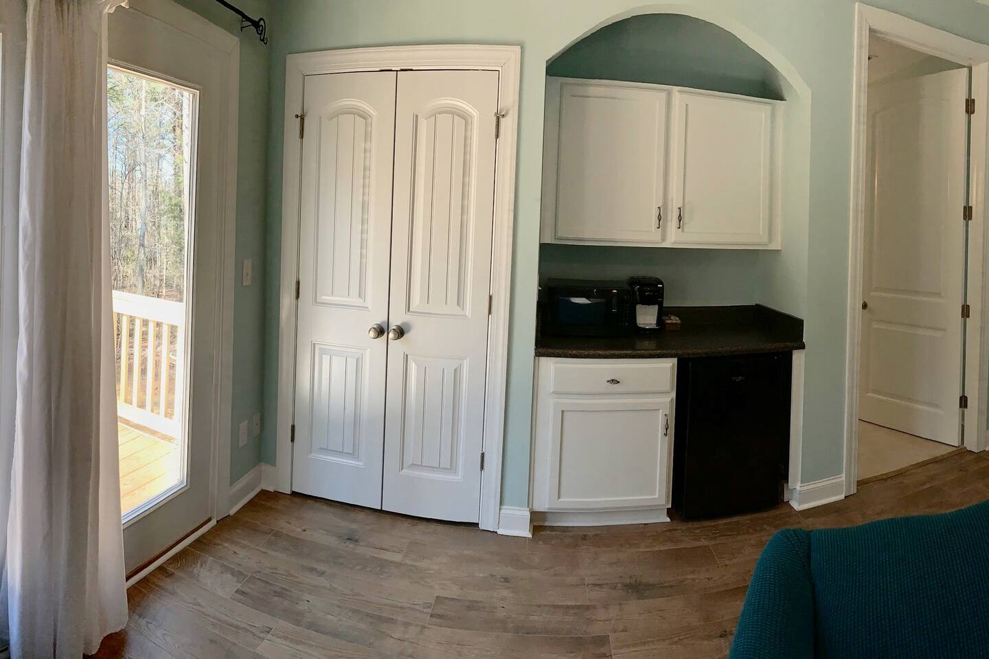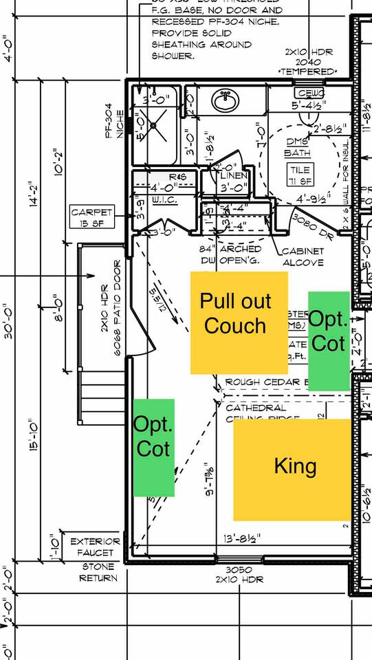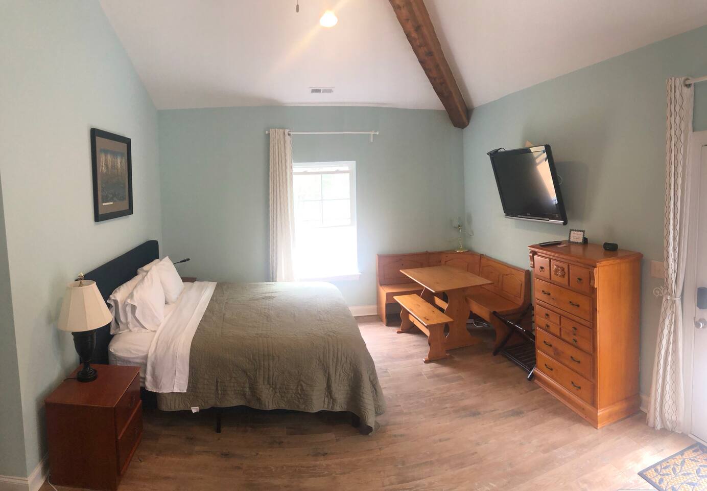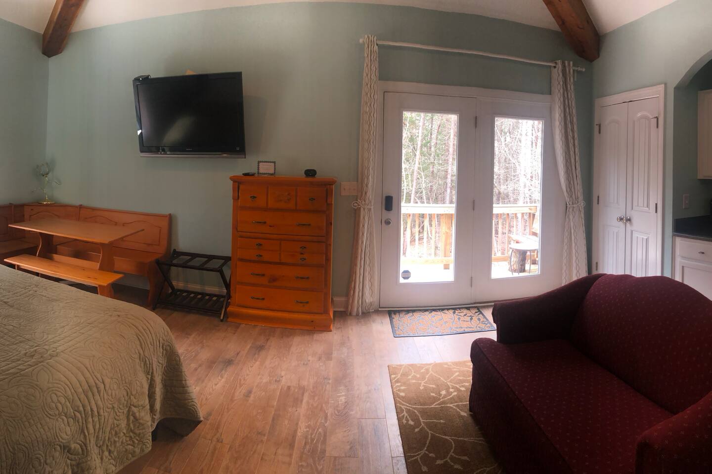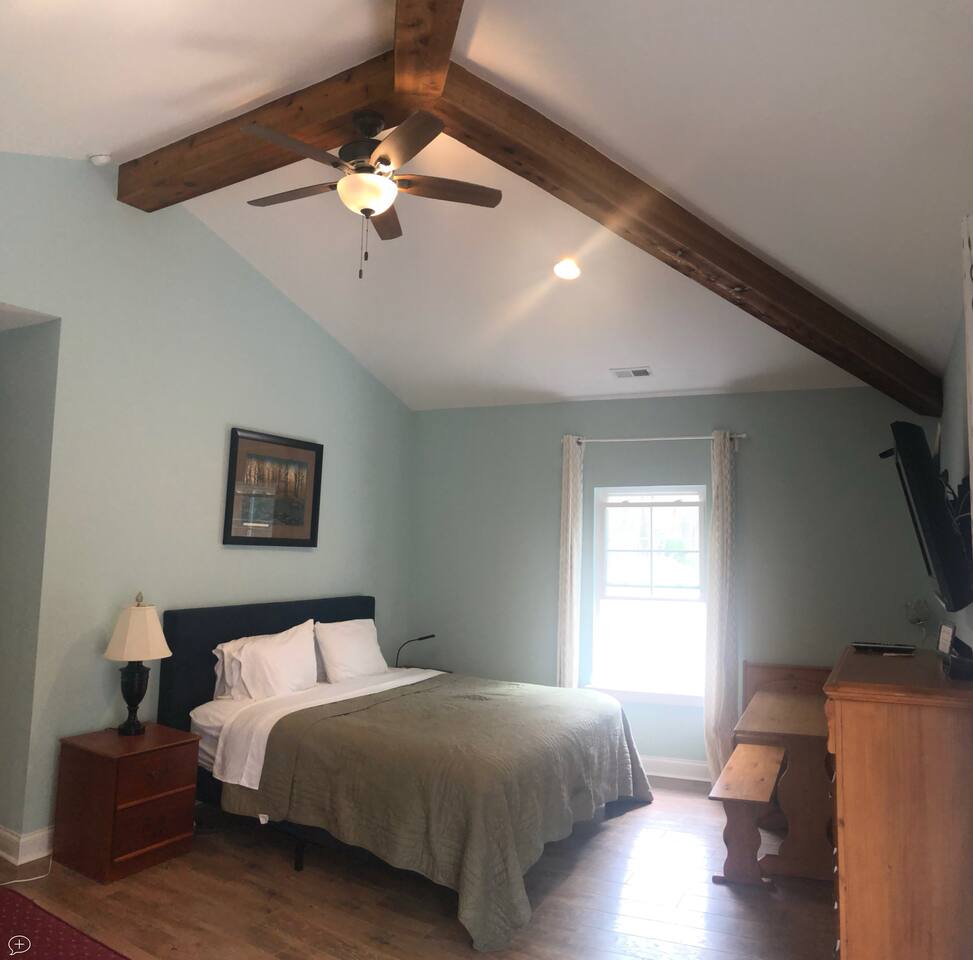 My favorite detail about your suite is the cathedral, cedar beamed ceiling. Also you have a kitchenette with fridge/ microwave and k-cup machine. Our king sized bed is actually two twins that you can separate if needed. The couch folds out into a full (sheets in closet) and we also have two twin cots beds (in closet, sheets in side of cot) and a pack and play crib. You have a personal thermostat and your own AC zone. There are coffee mugs you can borrow, and flatware. *Pets are welcome but please make sure they are on the listing so we know what pets are on site.